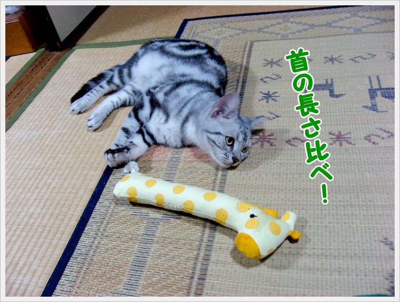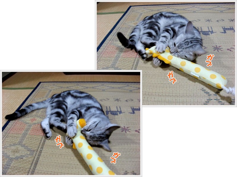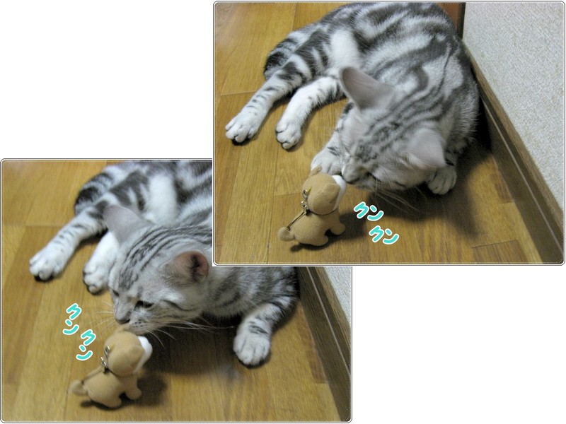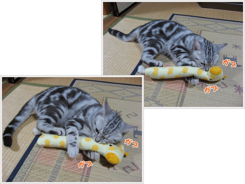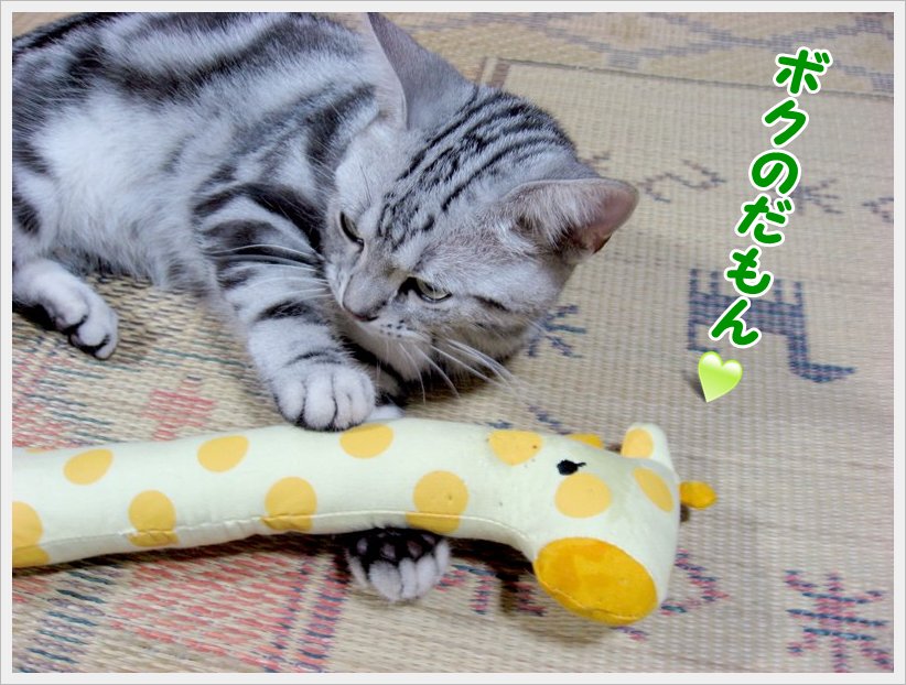 「チュモン、ちょっとだけこっち向いて!」 「ね、お願い♪」 「無視しないでよ~ 「眠っちゃった? じゃあ、チュモンの寝姿写真を撮っちゃおう 気持ちよいお昼下がりにウトウトして眠ってしまったチュモンくん さて、最近、チュモンくんの周辺に劇的な出来事が・・・ 前回はチュモンくんとハチくんのご対面にコメントを頂き ☆★☆ ・・・・・ ★ ・・・・・ ☆★☆ 今回は、キッカーで遊ぶチュモンくんです! 「チュモン、ガブガブしたらキリンさんが可哀想でしょう! 「渡さないなら、他の遊び方をして!」 「またガブガブしてる~ 「もうガブガブしたらだめよ!」 結局、いつまでもガブガブしているチュモンくん! 前回はチュモンくんの誕生日にお祝いの